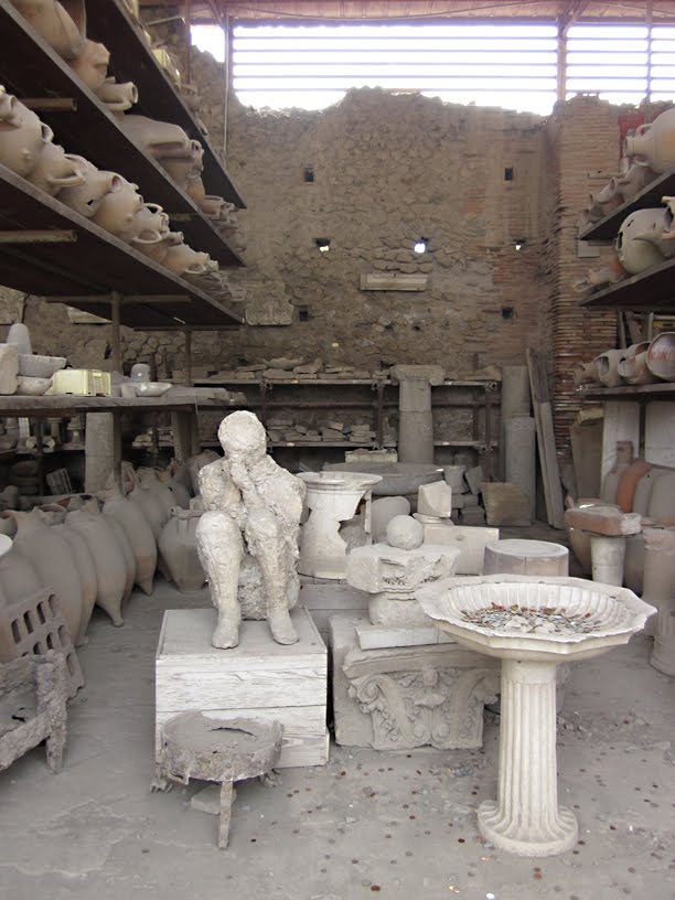 In a building they've been collecting artifacts they find to put on display. These are mostly wine vessels, but they've included a few plaster casts of the indentations left be people who died in the eruption.