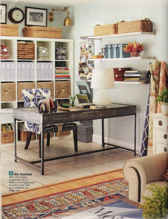 You can create a beautiful office space in an open floor plan living situation or in the corner of another room. This one is in one end of a living room. The tiled floor creates a visual barrier, separating the office into a separate space. And look at the cubbies and matching baskets!